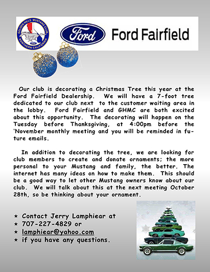 Hello GHMC Members, We have a Wonderful opportunity to get our club noticed and spread some Christmas cheer! Our club will be buying and decorating a Christmas Tree this year at the Ford Fairfield Dealership. We will have a 7-foot tree dedicated to our club next to the customer waiting area in the lobby. Ford Fairfield and GHMC are both excited about this opportunity. |